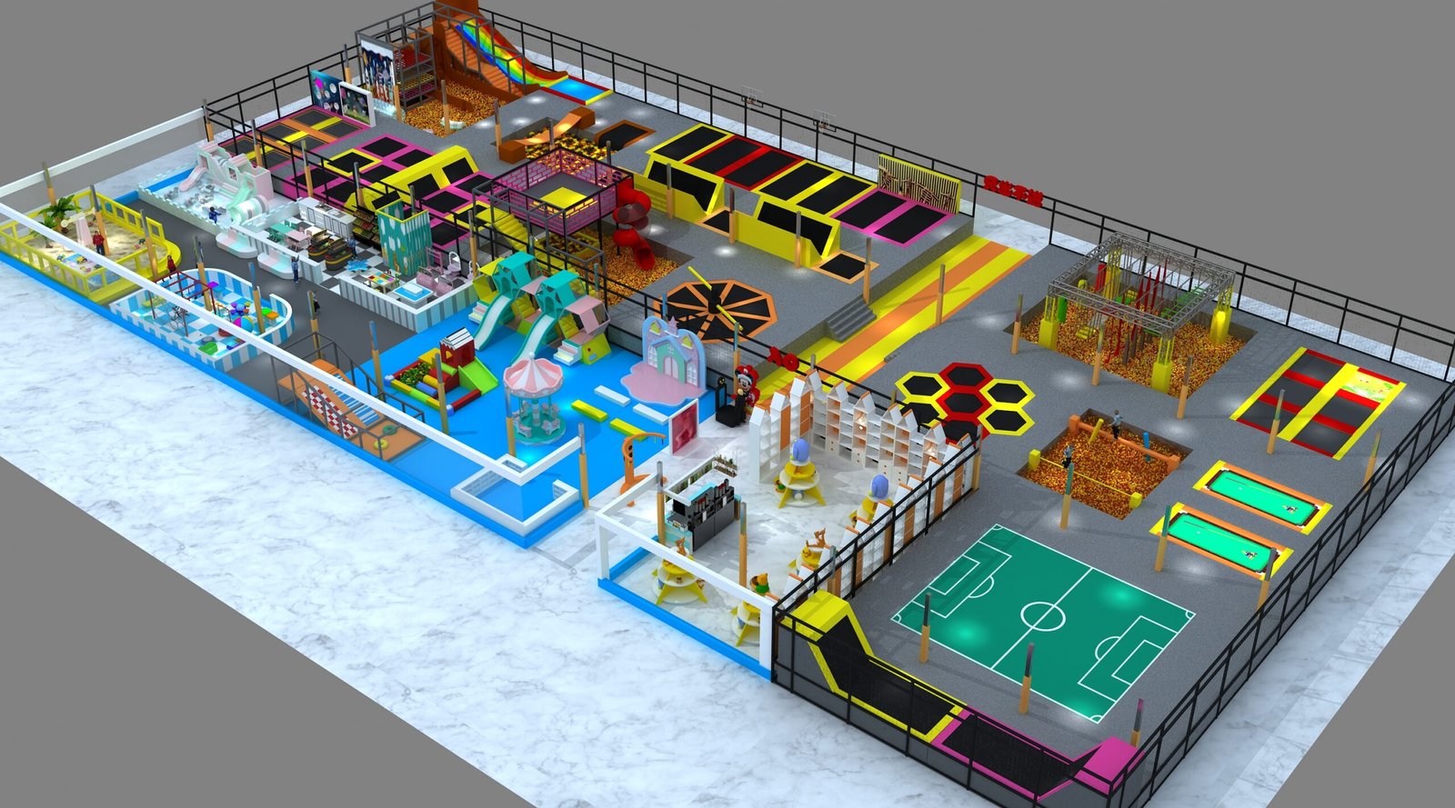 Indoor playground for kids is usually opened to children less than 12 years old, so whole playground shall be covered with soft surfacing, and play equipment without motor or with very small watt motor to guarantee safety and no noise. What’s more, themed main color and play equipment inside shall match each other. The above products sell well and are loved by customers.